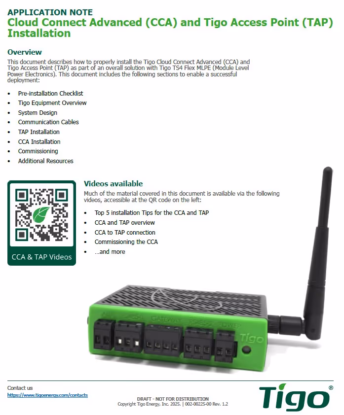 This document describes how to properly install the Tigo Cloud Connect Advanced (CCA) and Tigo Access Point (TAP) as part of an overall solution with Tigo TS4 Flex MLPE (Module Level Power Electronics). This document includes the following sections to enable a successful deployment: