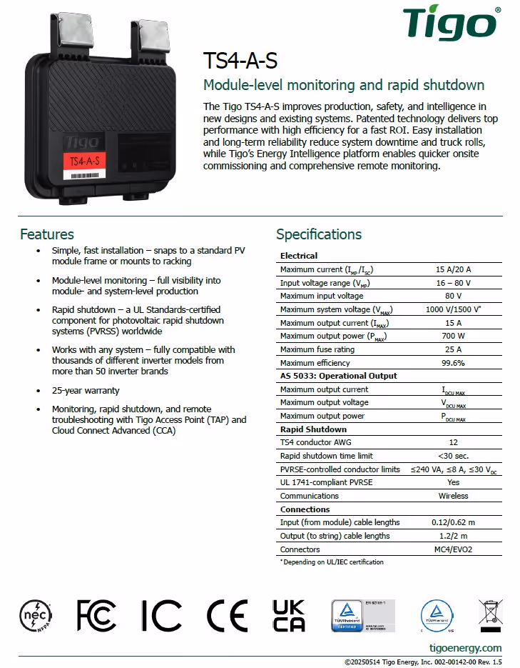 The TS4-A-S (Safety) is the advanced add-on module-level solution that brings safe and smart module functionality to standard PV modules for higher reliability. Ensure safety by adding safety features to new installations or by upgrading existing PV systems. Last updated: 3/28/2022
