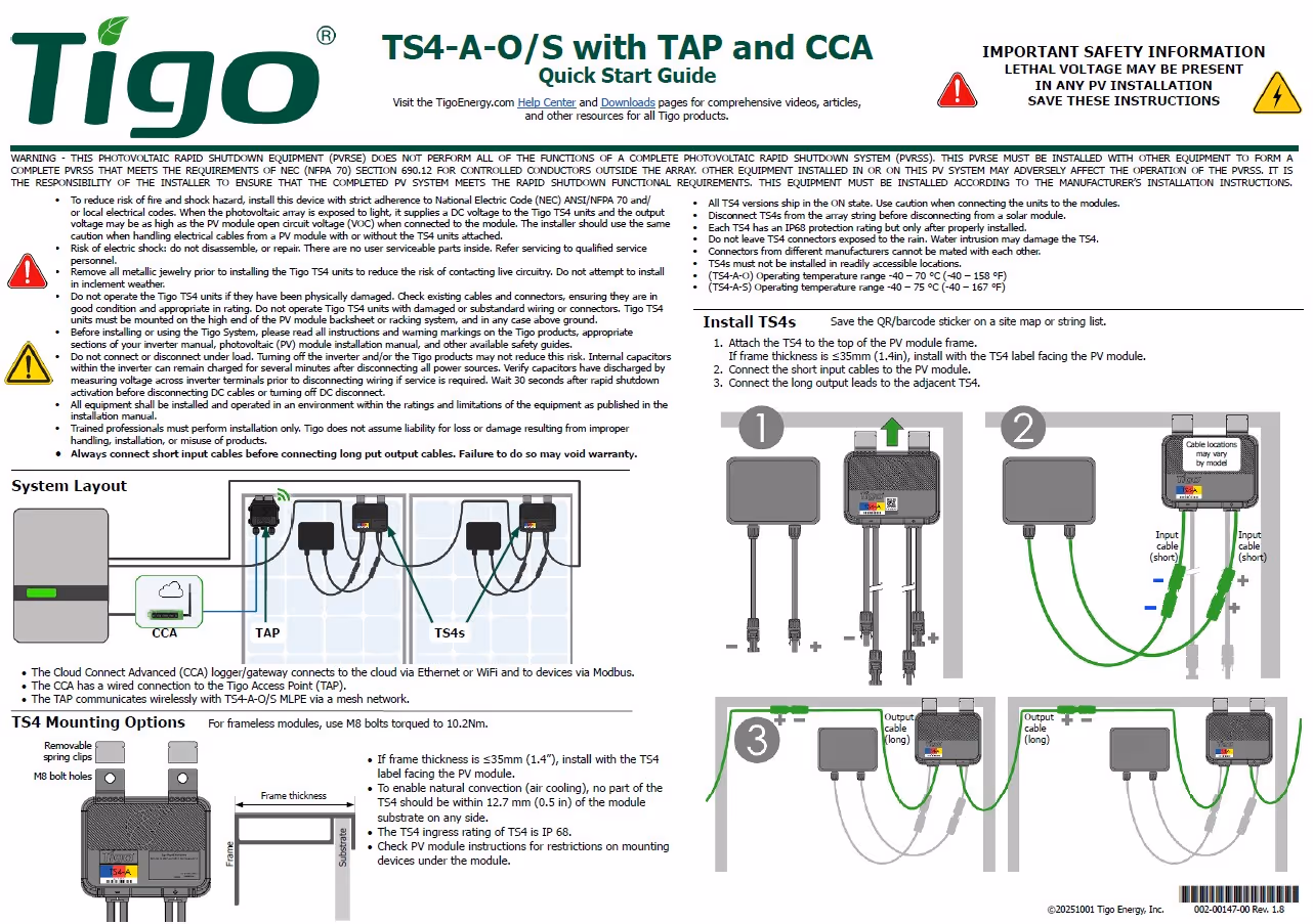 A Quick Start Guide for the TS4-A-O and TS4-A-S that pair with the Tigo Access Point (TAP) and Cloud Connect Advanced (CCA). This guide shows how to install and commission the Tigo products.