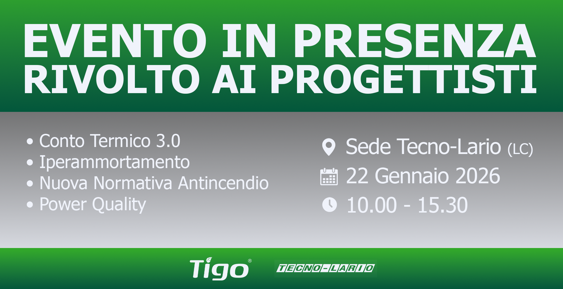 Tigo Energy, Tecnolario, and other leading industry players invite you to Lecco on January 22, 2026, for a technical seminar dedicated to PV system designers, focused on regulatory updates and market opportunities for 2026.