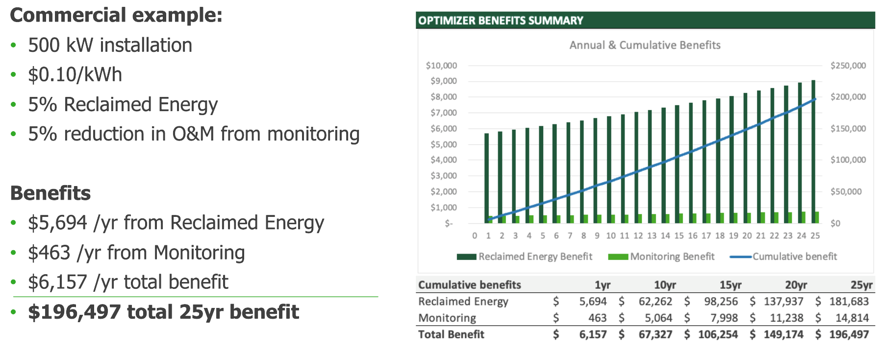 We have looked at how monitoring could help operation sand management (O&M) activities and how reclaimed energy is reported. And when I put just those two items together to weigh the benefits, it may look something like these examples.