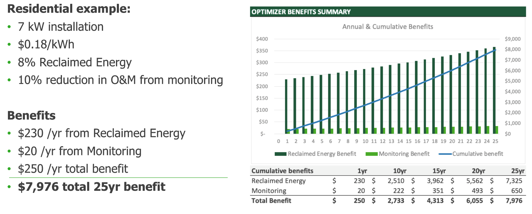 What we see is $230 per year extra from the Reclaimed Energy,$20 a year from monitoring the reduction in O&M costs and together that's $250 at the first year and slightly more each year after that for 25-year benefit totaling almost $8,000. And this is just a seven-kilowatt system.